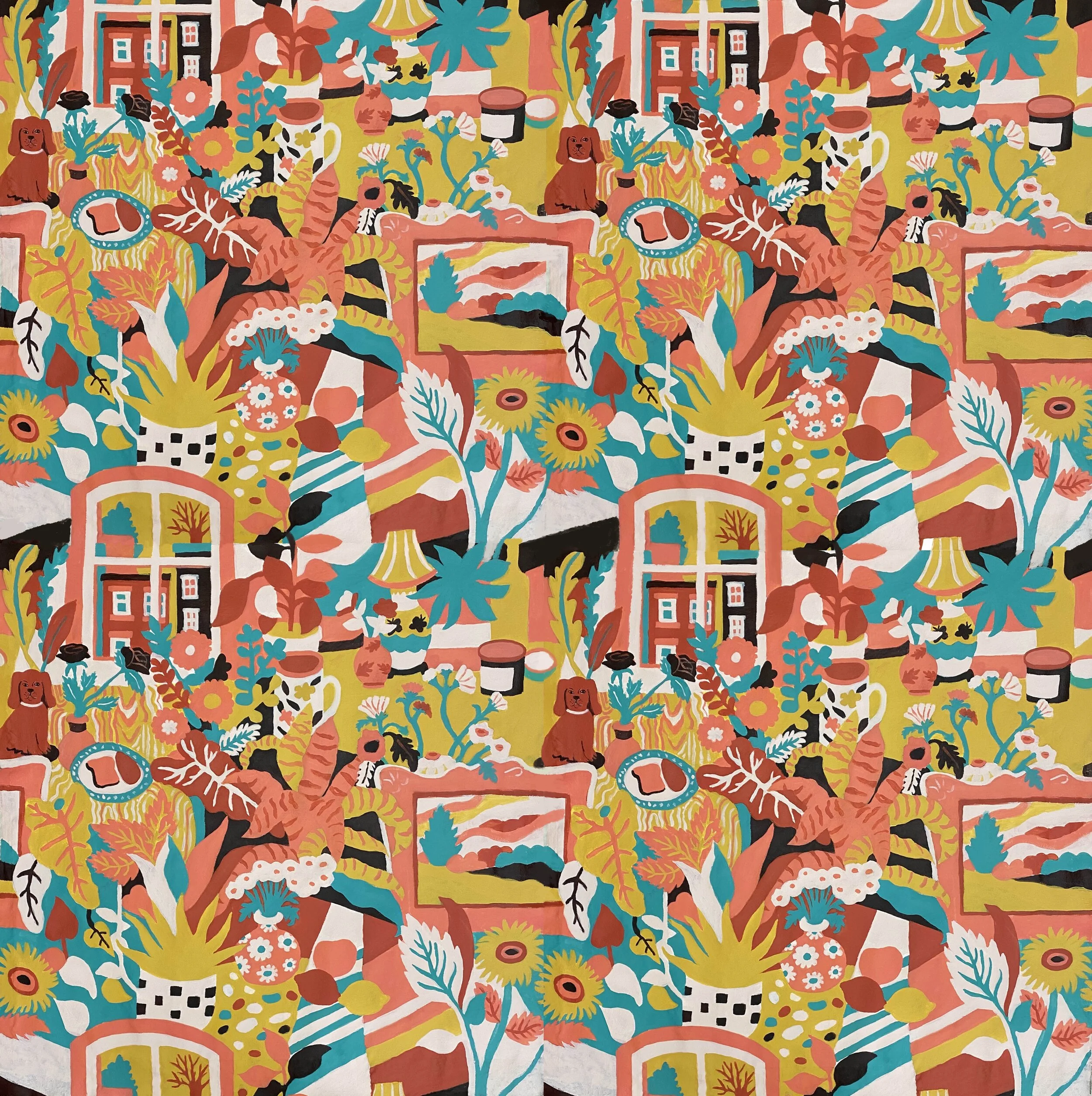 This is a six-color, 4’x4’ hand-painted repeating pattern. It came to be from spending many months spent inside, and learning to appreciate and study the often overlooked items that make a house a home. I created 40 paintings of still-life objects and houseplants, then scanned, printed and collaged them into an 8’x8’ repeating pattern. Then, I traced the 4’x4’ straight repeat, transferred to canvas and created a six-color design. Scroll to the gallery to see process!